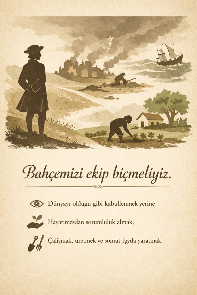 Romanın sonunda Voltaire, büyük teorilerden çok eyleme işaret eder: